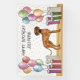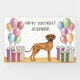 Destei's original cartoon illustration of a cute Rhodesian Ridgeback breed dog. The dog is placed in a colourful birthday setting with pastel colour birthday balloons and presents. The pastel colours include pink, green, blue, red, orange and purple. The dog is standing on a yellow wood floor texture and the background has a playful pastel colour polka dot pattern. There is also a personalizable text area.