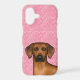 Destei's original cartoon illustration of an adorable Rhodesian Ridgeback breed dog's head close-up portrait on a pink background colour with a pattern of hearts in different sizes.