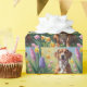 A cheerful dog sits peacefully on lush green grass, surrounded by colourful spring blooms under a soft blue sky. This digital oil painting captures a serene moment with expressive brushstrokes, warm colours, and a sense of gentle joy.