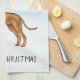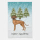 Destei's original cartoon illustration of a cute Rhodesian Ridgeback breed dog. The dog is placed in a winter scene with three green fir trees and falling snow. The background is a blue to white gradient giving the design that cold winter day look. There is also a personalizable text area that now reads: "Merry Christmas!".
