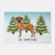 Destei's original cartoon illustration of a cute Rhodesian Ridgeback breed dog. The dog is placed in a winter scene with three green fir trees and falling snow. The background is a blue to white gradient giving the design that cold winter day look. There is also a personalizable text area for a name.