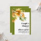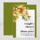 This fall wedding shower invitation showcases a white frame surrounded by borders in an olive green hue and rhododendron branches adorned with orange yellow flowers positioned elegantly in the upper left corner and. The text on the invitation is displayed in a striking bold typography, adding a touch of sophistication to the overall look. The olive green borders frame the invitation on three sides, enhancing the natural and organic feel of the design.