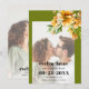 This elegant fall Save the Date announcement for a wedding showcases a beautiful photo of the couple surrounded by a rhododendron branch with orange yellow flowers in the top right corner. The olive green borders add a touch of sophistication to the entire layout, perfectly complementing the modern and stylish look achieved by the bold typography of the text. Flipping to the back reveals yet another lovely photo of the couple, adding a personal touch to the announcement.