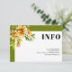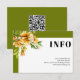 Rhododendron branch with orange yellow flowers fall wedding details enclosure card with QR code. This wedding details card features a clean, elegant design with a white frame and olive green borders. In the top left corner there is a delicate rhododendron branch with orange, yellow blossoms, while the word "INFO" stands out in bold type. The back is an olive green color and includes a QR code. Guests can scan it to easily access more information—simple, stylish, and friendly for everyone.