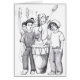 A group of eight teenagers are seen dancing and playing music. In the front are two young men each with drumsticks beating one large drum. Behind them are six other young men and women. One girl is seen playing a tambourine. A young man plays the cymbals. In back a young man raises a drumstick into the air. They are all happy playing music and dancing to the rhythm. Concept designed and commissioned by Lee Serenethos. Drawing by John Wampler in black, white, grey. 1_rhythm_drum_dancing_people_OPG200X10