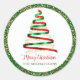 This festive holiday sticker features ribbon Christmas tree in red and green with gold glitter accent. Text "Merry Christmas" in red. Perfect for sending season's greetings to everyone on your list.