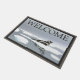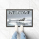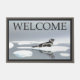 A digital painting of a brown and white Ribbon Seal resting on an ice floe on a very grey and dreary day. Text reading, "WELCOME" also appears.