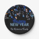 Personalised New Year paper plate design featuring shiny ribbons and bokeh lights on a black background. The text is fully customisable.