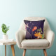 Rich elegant floral throw pillow features a stylish botanical floral print with a modern abstract backdrop. An artistic layered design featuring yellow and orange blooming flowers with green accents on a deep rich eggplant background with complimentary luxe golden lines and geometric circular shapes with stylish pink accents. The layered elements create depth and perspective within the overall design.