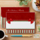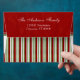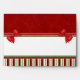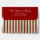 Pretty textured red and green vertical candy cane style stripes on a white background decorate the lower portion of the front and all over the back and inside of the envelope. Matching red and green ribbons span just below centre horizontally with pretty red bows framing the address area. The upper portion of the front and the back flap are covered in a rich textured red. Template fields are provided your your name and return address that display on the back flap in a white font. Artwork and design by Karlajkitty