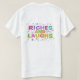 Brighten up your wardrobe with our "Riches and Laughs" t-shirt! This playful design showcases the phrase "Riches and Laughs" in bold, multicolored letters, surrounded by confetti-like shapes and dollar signs. The festive and celebratory atmosphere of this shirt makes it perfect for spreading joy and good vibes. Made from soft, high-quality fabric, it's ideal for any casual occasion or just adding a splash of fun to your day.