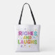 This shoulder tote bag design showcases the vibrant and playful phrase "RICHES AND LAUGHS" surrounded by colourful confetti and dollar signs, making it a lively and cheerful accessory for everyday use.