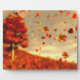 Against the backdrop of a lone maple in a hillside, bright orange and yellow autumn leaves float on the breeze.