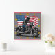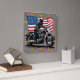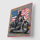 A rider on a motorcycle, dressed in leather, speeds forward with the American flag waving proudly in the background, embodying freedom and adventure.