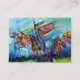 Mediaeval knights with horses ,colourful and expressive contemporary figurative painting in vibrant blue,red,green white,brown colours,watercolor by Alessandro Lumini 1989 Inspired from the legend of King Arthur and the Knights of the Round Table .