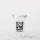 This acrylic drink tumbler with straw and lid has a a black and white illustration of LIttle Red Riding Hood talking to the woods on her way thru the woods under trees wearing a hooded cape in an ornate black frame on the front and back.