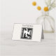 This folded standing place card for your parties, events, and weddings is done in black and white with a silhouette image of little red riding hood sitting under trees in the forest talking to the wolf in a black fancy border. Customise the name and table number area and text on the back with the templates.