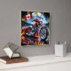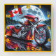 A stunning chopper adorned with flames rides along a moonlit river, proudly flying the Canadian flag against a backdrop of trees and a bridge.
