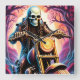 a skeleton gripped in pandemonium bike. Riding through the intertwining branches on the trail .He had a hopped-up .He has a black leather trousers and motorcycle boots And a black leather jacket with bone like design on the bilker outfit .With the sun going down behind him. Haze rising up from around him into the dark night he rids away with night stars above.