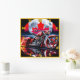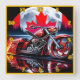 A striking custom motorcycle sits in front of a Canadian flag illuminated by the full moon, reflecting on a wet roadway during a vibrant night.