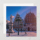 Sunset over covered in snow Riga Town Hall Square in winter in Riga, Latvia. View of famous House of the Blackheads and Roland's Statue against blue sky with sunset lights.
