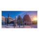 Sunset over covered in snow Riga Town Hall Square in winter in Riga, Latvia. View of famous House of the Blackheads and Roland's Statue against blue sky with sunset lights.