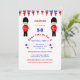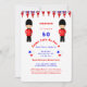 Distressed Union Jack and cartoon queens guards in red, white and blue; fun British themed party invitation shown here for a 50th Birthday but feel free to edit it to suit any birthday or event.