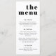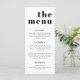 This menu features a bold serif font and a modern minimalist design. Use this template to edit the fonts, font colour, and background colour to match your event needs.This menu makes the perfect addition to your simple contemporary, retro or bohemian baby shower, bridal shower, wedding, retirement or any other event! This table menu features a simple white and black colour combination but all colours are 100% editable to match your style.