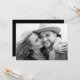Spread the news of your engagement with these unique engagement announcements. The announcement features your horizontal photo with the phrase "Ring in the New Year" in an elegant white script. Personalise the front of the photo engagement announcement by adding your names and engagement date. An optional gradient is provided to help separate the text from your photo. The card reverses to display an additional engagement photo with additional details shown below in white lettering on a black background or colour of your choice. The design is perfect to use for New Year engagement announcements!