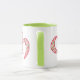 A fun Ringer Mug with a Green lip and handle and the Welsh word 'cwtch', meaning 'cuddle' or 'hug', in a Celtic script, filled with a pretty red, green and white floral pattern.