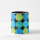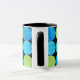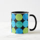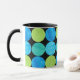 A white ringer mug with a black lip and handle and a 'Blue Moons' abstract pattern in bright blues and neon green on a black background; from a handpainted paper collage design by Judy Adamson.