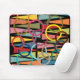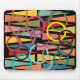 This mouse pad has a mid-century modern design of triangles and rings in retro colours on a field of black.