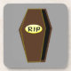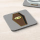 This awesome cork coaster features a creepy coffin made from wood with gold edging. The coffin lid is slightly open revealing only darkness within. The gold plaque on the front of the coffin has spooky black text on it that says RIP, giving no clue who or what might be lurking inside. This fun yet sinister coffin is ideal for Halloween. The bleak gray background acts to draw the eye of the observer toward the coffin of doom.