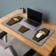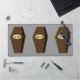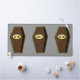 This awesome desk mat features a creepy coffin made from wood with gold edging. The coffin lid is slightly open revealing only darkness within. The gold plaque on the front of the coffin has spooky black text on it that says RIP, giving no clue who or what might be lurking inside. This fun yet sinister coffin is ideal for Halloween.