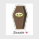 This awesome shaped sticker design features a creepy coffin made from wood with gold edging. The coffin lid is slightly open revealing only darkness within. The gold plaque on the front of the coffin has spooky black text on it that says RIP, giving no clue who or what might be lurking inside. This fun yet sinister coffin is ideal for Halloween.