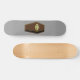 This awesome skateboard features a creepy coffin made from wood with gold edging. The coffin lid is slightly open revealing only darkness within. The gold plaque on the front of the coffin has spooky black text on it that says RIP, giving no clue who or what might be lurking inside. This fun yet sinister coffin is ideal for Halloween. The bleak grey background acts to draw the eye of the observer towards the coffin of doom.