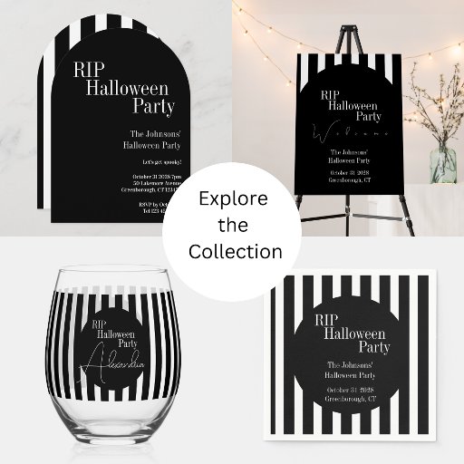 This RIP theme, black and white Halloween party design features stylish typography and a chic modern design with a black and white stripe. Perfect for hosts planning a spooky, RIP themed Halloween celebration. Perfect for a timeless Halloween RIP themed party invitation!