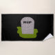 This awesome beach Towel features a grey tombstone with RIP in dripping black text on it, standing on a patch of green grass. Befitting of this morbid design the background is black.