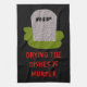 This awesome kitchen towel features a grey tombstone with RIP in dripping black text on it, standing on a patch of green grass. Befitting of this morbid design the background is black. There is funny red customisable text that reads "Drying the dishes is murder"