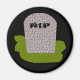 This magnet features a grey tombstone with RIP in dripping text on it, standing on a patch of green grass. Befitting of this morbid design the background is black.