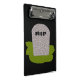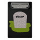 This awesome mini clipboard features a grey tombstone with RIP in dripping black text on it, standing on a patch of green grass. Befitting of this morbid design the background is black.