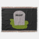 This awesome throw blanket features a grey tombstone with RIP in dripping black text on it, standing on a patch of green grass. Befitting of this morbid design the background is black.