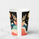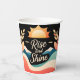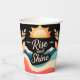 A bold and uplifting illustration featuring a radiant sunrise over stylised mountains in shades of blue and white. The sun’s golden rays stretch outward, flanked by abstract leaves that frame the scene with warmth and vitality. The foreground flows with wavy patterns in red, pink, and cream, adding dynamic energy to the composition. Centred in elegant typography, the phrase “Rise and Shine” reinforces the theme of positivity and renewal—perfect for inspiring a bright start to the day.