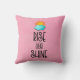 A pillow with a cute typographical design. A fluffy cloud and an orange sun set on a light pink background.