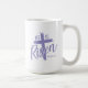 Coffee mug is shown in purple and white with a He Is Risen print.