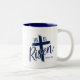 Coffee mug is shown in navy and white with a He Is Risen print.