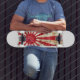 This item has the Japanese Rising Sun flag in a distressed style that is at a slight angle. The flag is cropped in a horizontal bar with dissolved edges. The design is similar to the flag of Japan in that it has a red circle close to the middle signifying the sun, the difference being the addition of extra sun rays (16 for the ensign) exemplifying the name of Japan as "The Land of the Rising Sun".
