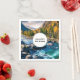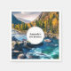 Paper napkins with a scenic photograph featuring tree covered mountains in autumn colours. A vibrant river flows around a multitude of rocks.