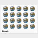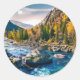 Stickers with a scenic photograph featuring tree covered mountains in autumn colours. A river flowing around rocks. A large white full moon hovers above.