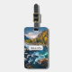 A luggage tag with a scenic photograph featuring tree covered mountains in autumn colours. A river flowing around rocks. A large white full moon hovers above.